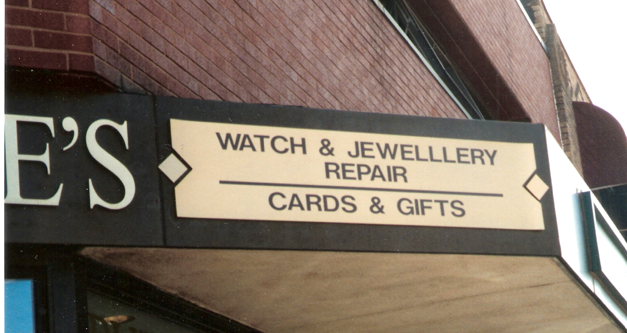 Strolling along the street downtown, I stopped to window shop in a jewelry store. The first thing that caught my eye was that “jewelry” was spelled with one “l” on the door, and two “l’s” on the window! No doubt, an American sign maker was responsible for the former, a British one for the latter. And then I looked up to see this on the awning. I approached the owner and shared with her the different spellings on the window and the door. “Oh, yes, she said, in America it’s one “l”, in England it’s two.” I called her out to the street and pointed to the awning. She was surprised and upset. “My husband bought that six months ago for $5000 and no one’s noticed it in all this time!”