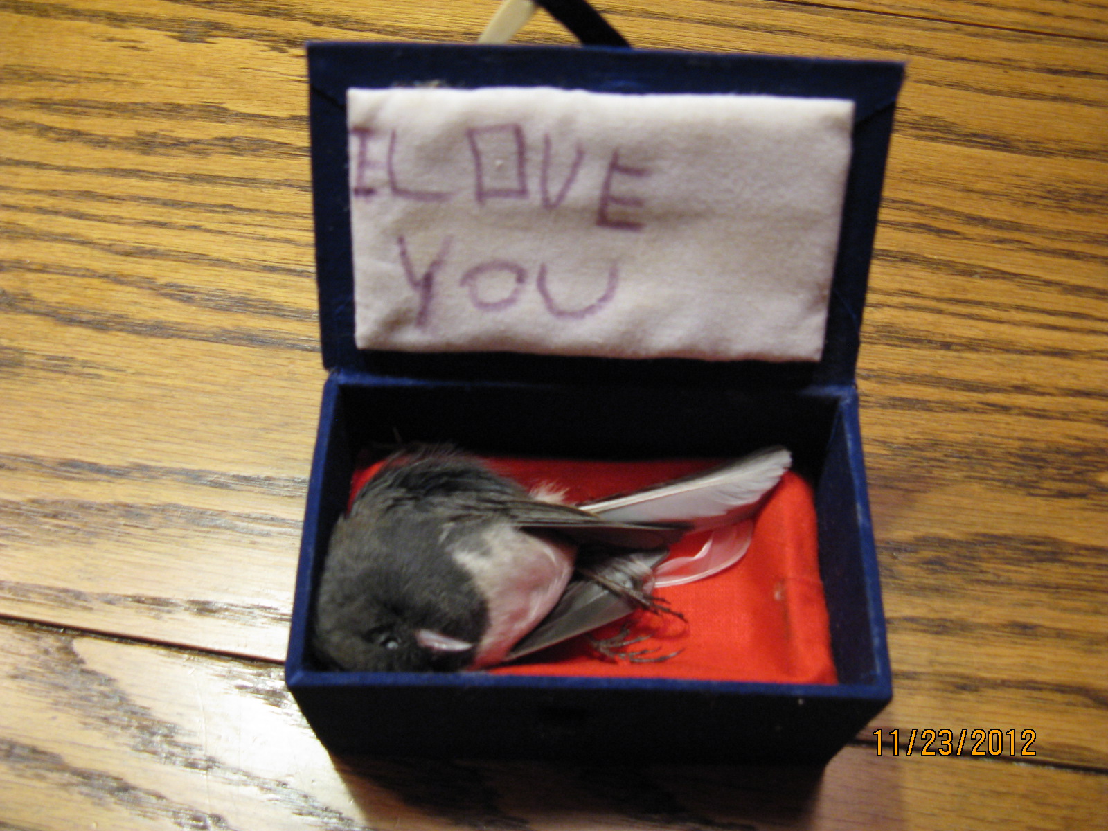 We found a small “casket” and Lila wrote a note on the inside. I shoved it in the freezer, between lentil soup and a box of White Castle burgers. There it will stay until she comes again. I am certain it will be the first thing she’ll ask about!bird casket