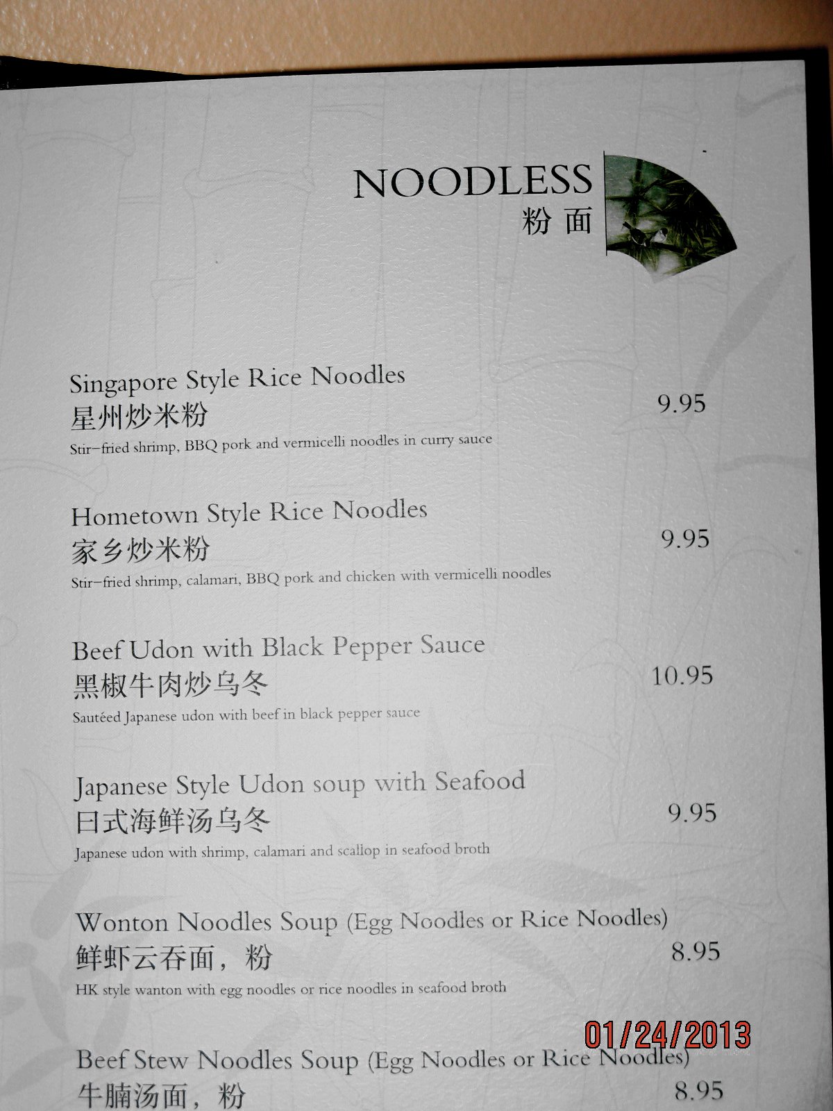 When I brought it to the manager’s attention, he said that he already knew. But the menus were printed in China and it would be a monumental task to have them redone or corrected. “So,” he said, “we’ll just pretend that we don’t have any noods. Our restaurant is entirely noodless.” At least he had a sense of humor about it.