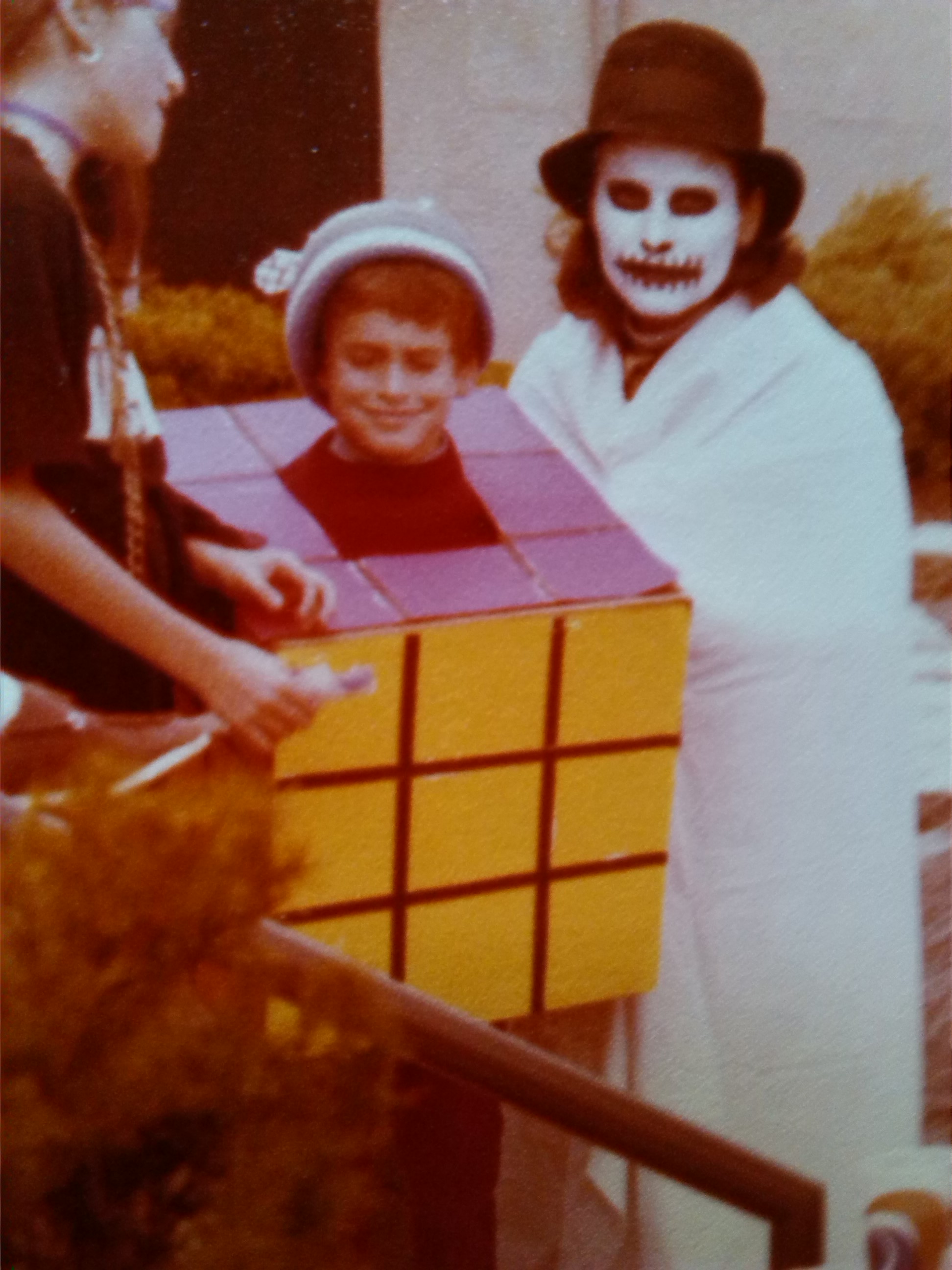 “Do a Rubik’s cube,” my friend suggested, “you take a box, cut out a head hole, and draw or paste on squares!” I could do that!  Here’s how it came out. And there, next to him, am I, in face make-up that another teacher gave explicit directions for. She even drew them on paper for me. Obviously, I couldn’t come up with something to wear, so draped a sheet over myself.Lew Rubrik