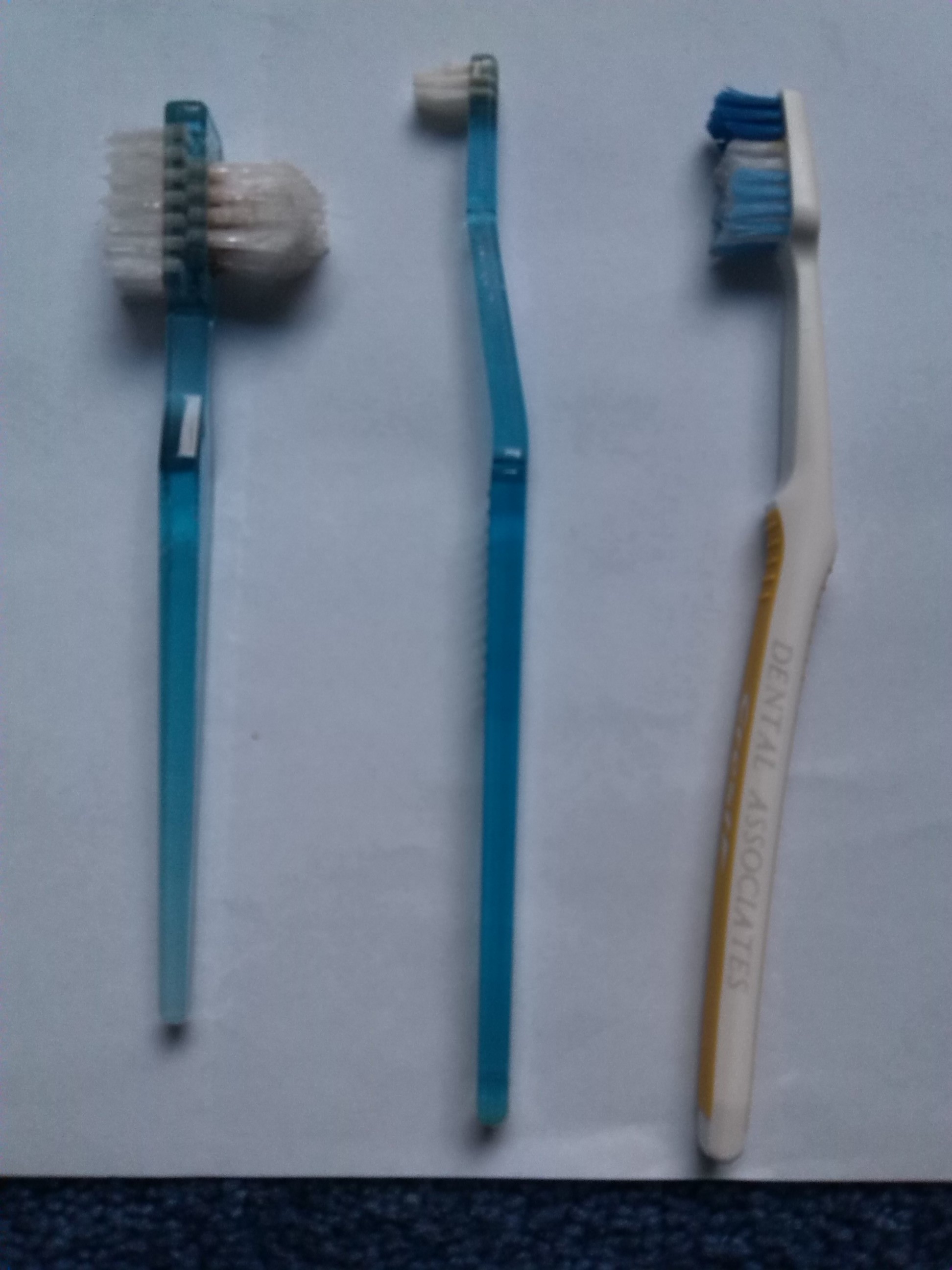 And the teeth … years ago, my dentist informed me that I was going to have to undergo surgery. I begged him to give me something I could do to reverse the damage. He sent in the hygienist who gave me instructions on several techniques to help. I left with a handful of implements to use. These now reside in my Tooth Box which I use every night (I never needed the surgery.) Trouble is, every time I visit the dentist, I get more stuff to use. Below are 3 different brushes I use every day: The one on the left cleans the mouth appliance I use at night because I grind my teeth, the one in the middle is to get to those places brushes often miss (like behind the teeth in the center of your mouth) and the last is my everyday toothbrush.