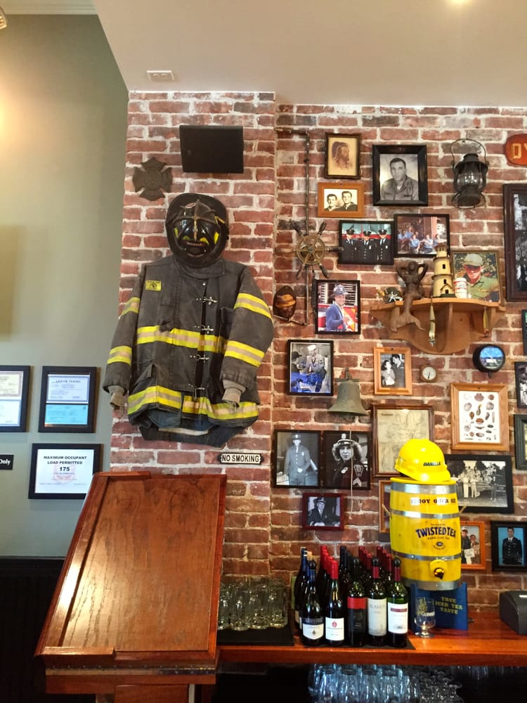 Walls are lined with photos of servicemen; police and firemen who come in leave their department patch that is then put on display. There are hundreds of them. It’s an Irish bar honoring our men in uniform. And pizza is the only food served.