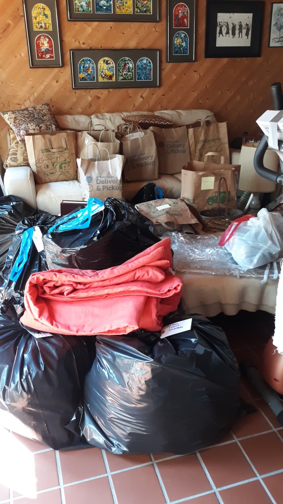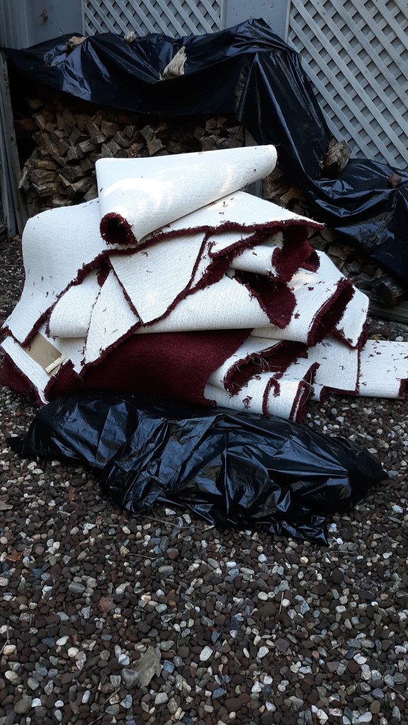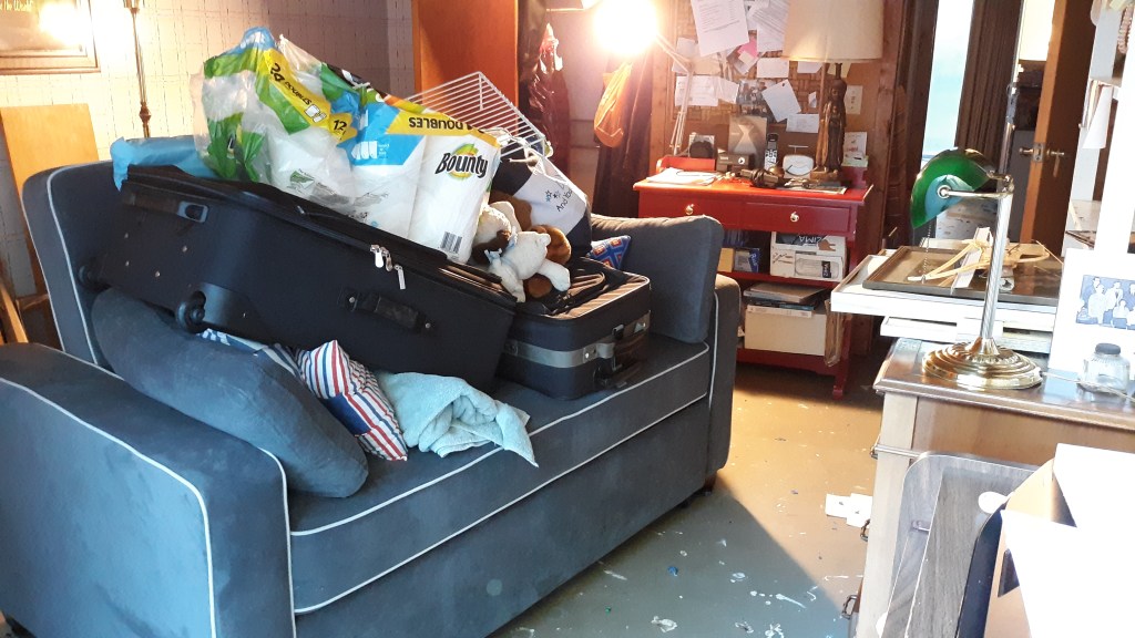 Bottom line: carpet removed in all 3 bedrooms, a company came to handle mildew and mold (removing wallboard 4 feet up from floor), all the furniture in my daughter’s room tossed, all the stuff in hers and my son’s bedrooms stored in a 20 foot storage unit on our property (I bagged and tagged all), leaving us to look for a place to stay while all this got repaired. Between 4 different companies, there were 2 Matts and 4 Mikes and it was up to me to keep them straight. I cajoled a man who had previously done construction for us to put us in his busy schedule. Oh, and did I say that insurance won’t reimburse us because we don’t have flood insurance?